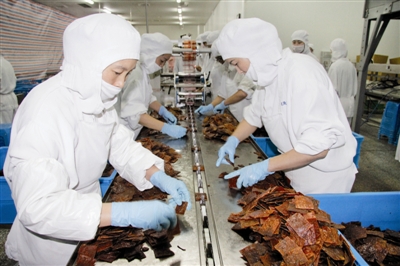 紧接着,猪肉脯小包装项目比赛有序进行,参赛员工分成数个小组,四人一组赴小包装肉脯生产线,要求在一分钟内完成比赛,并且成品须符合“速度达标”“空包数量可控”“每袋的片数在标准范围内”等要求,随着计时员倒计时读秒开始后,伴随传送带的滚动,选手们凭借灵巧的双手,熟练地将操作台上的小正片肉脯放入传送带上的夹槽内,经机器卷膜包装后有序出品。经过几组参赛员工的比拼,鞠秋萍、陈旭霞、刘桂凤、施锐凭借“快、狠、准”的手法荣获该项目团体优胜奖。