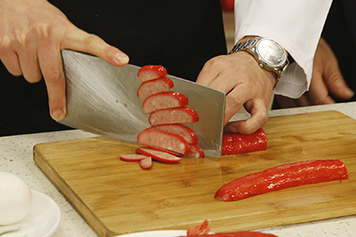 2.热油锅,倒入大豆油少许,将切好的“双鱼”特级灌肠倒入锅中翻炒至热即可出锅装盘;