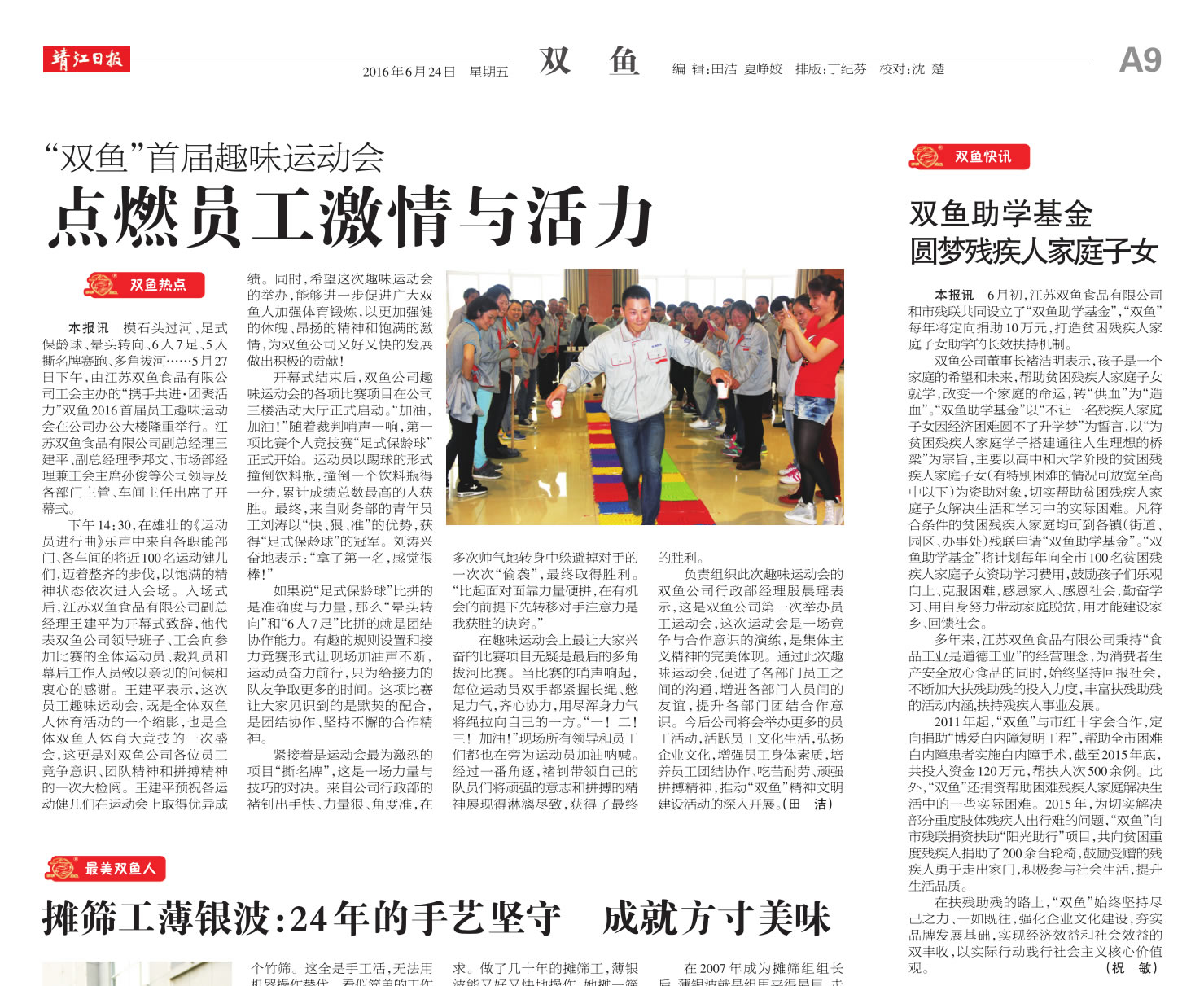 摸石头过河、足式保龄球、晕头转向、6人7足、5人撕名牌赛跑、多角拔河……5月27日下午,由江苏双鱼食品有限公司工会主办的“携手共进·团聚活力”双鱼2016首届员工趣味运动会在公......