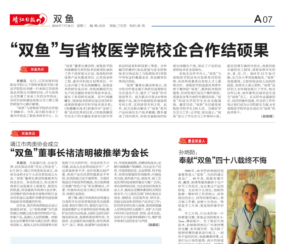 近日,江苏农牧科技职业学院(以下简称省牧医学院)食品学院院长刘靖一行来到江苏双鱼食品有限公司调研回访,并与双鱼公司签署了未来三年的合作协议,共同为加快建设双鱼公司......